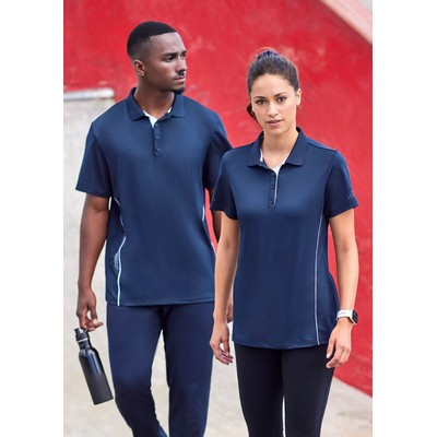 Features: Honeycomb weave with stretch elastane delivers style and comfort. Flat knitted collar with contrast button placket. Side panels with dynamic contrast piping. Unique print features on torso, sleeve and back neck to accent your logo. Longer length for added coverage when moving. Mens style includes loose pocket.