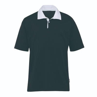 340gsm cotton polyester jersey, Short sleeve with gusset underarm, White contrast twill collar, Button on rib plaquet.