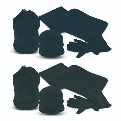 Delightful scarf, beanie and gloves set which is manufactured from warm, non-pilling polar fleece and is presented is a matching drawstring bag. The beanie has a roll up cuff and is available in one size which will fit most people. The gloves are available unbranded in one size and can be clipped together when not in use.